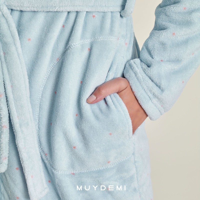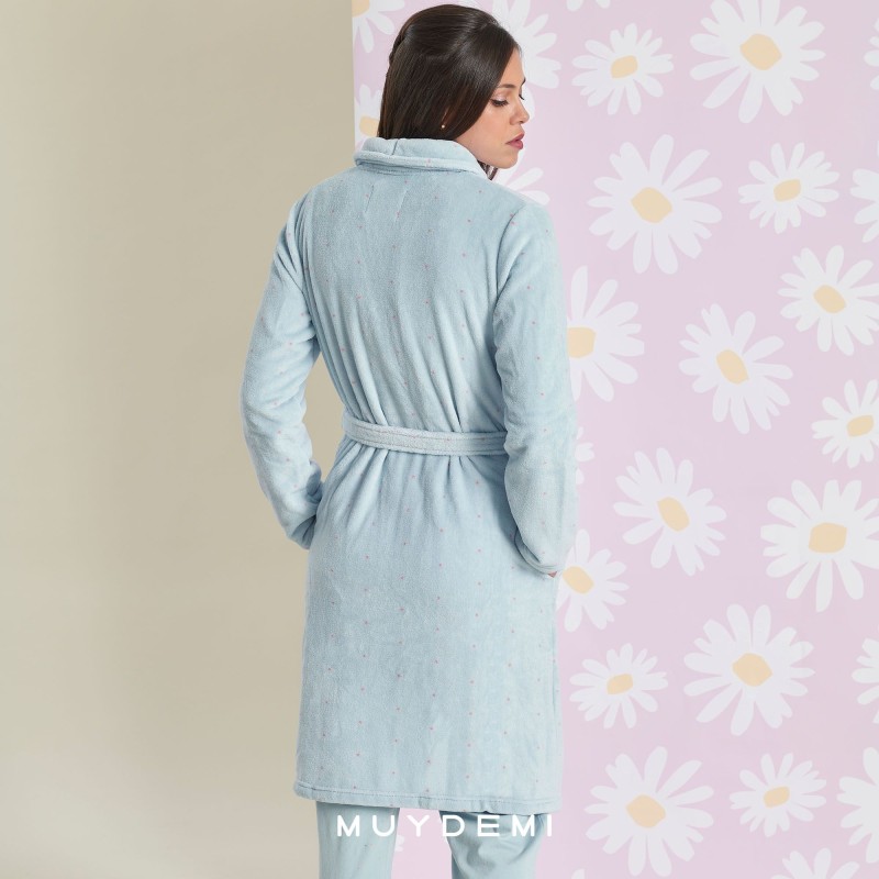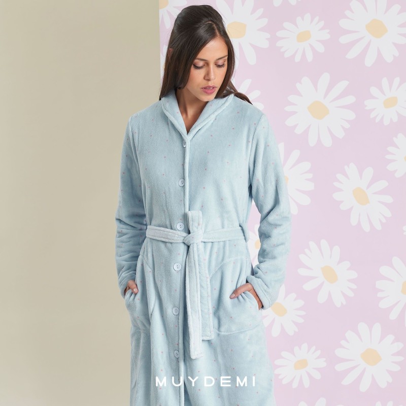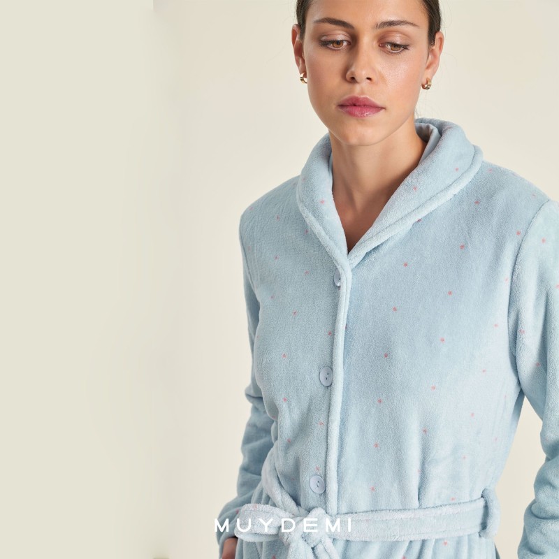 Bata de la marca Muydemi, realizada en tejido coralina, muy suave y calentito, pequeños lunaritos sobre fondo celeste, cierre de botones con cinturón ajustable, bolsillos laterales. Una bata ideal para los días más fríos. Puedes combinarla con cualquier pijama de la colección.