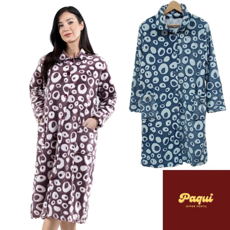 Bata polar de señora 2918 con cierre de botones que aporta abrigo y comodidad gracias a su tejido de coralina muy suave que no pesa. Estampado tipo círculos ideal para estar en casa con estilo durante el invierno.