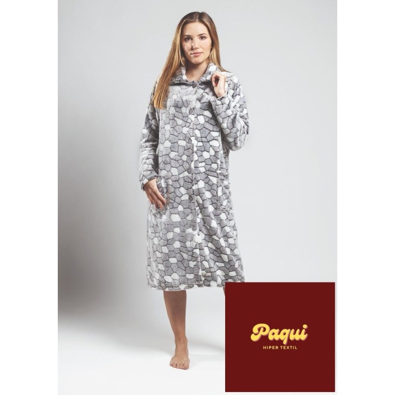 Bata coralina de mujer con estampado de piedra. Con bolsillos. Largo hasta rodillas. Cierre con botones.