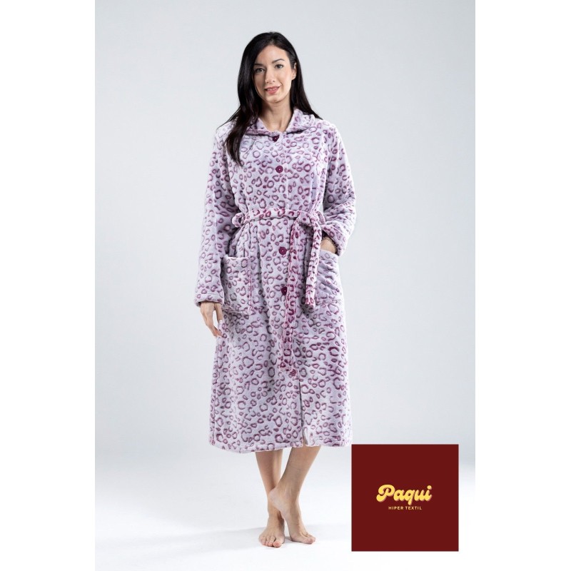 Bata de coralina para mujer con grabado de leopardo en colores burdeos. Con bolsillos. Cierre con botones y cinturón.