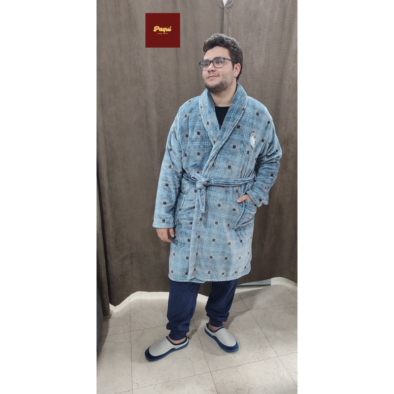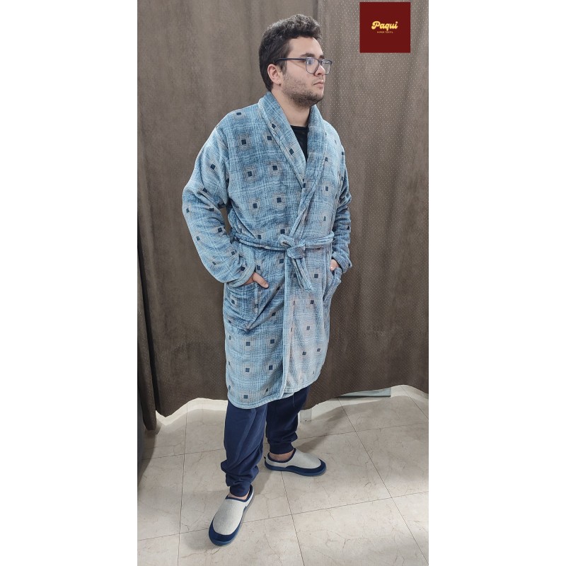 Bata coralina de hombre de cuadros  Con bolsillos. Largo hasta rodillas. Cierre con cinturón.