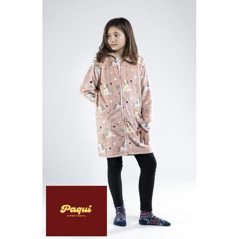 Bata para niña con cierre de cremallera en tejido de coralina de 290grs estampada de unicornios y estrellas. Bolsillos de parches. Presentación en percha y bolsa. 100% Poliéster