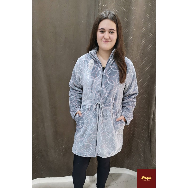 Bata invierno para mujer de corte juvenil hecha de coralina de la marca LIN, comodidad y estilo en tus momentos de relax. Presenta un cierre con cremallera y su diseño incluye un estampado geometrico y cuenta con un cinturón ajustable en la cintura. Además, tiene bolsillos y es muy cálida y cómoda, ideal para el clima frío.