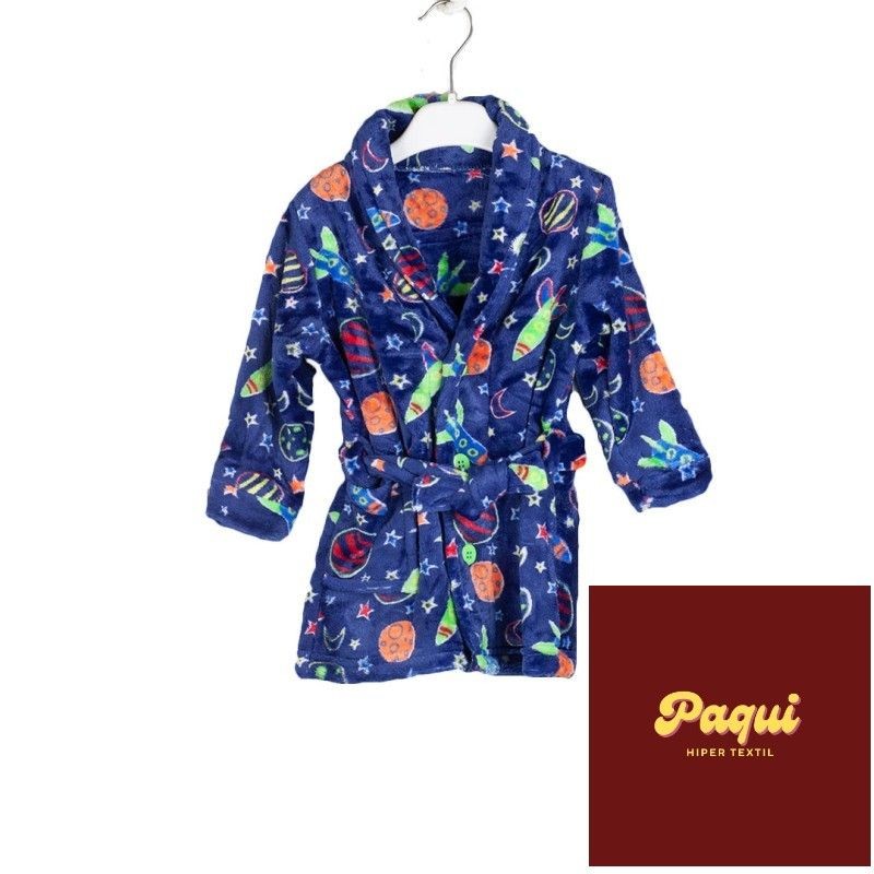 Bata de coralina para niños. Modelo original con cierre de cinturón y divertido y alegre estampado de motivos espaciales. Muy suave y cálida, ideal para sentirse abrigado en casa.