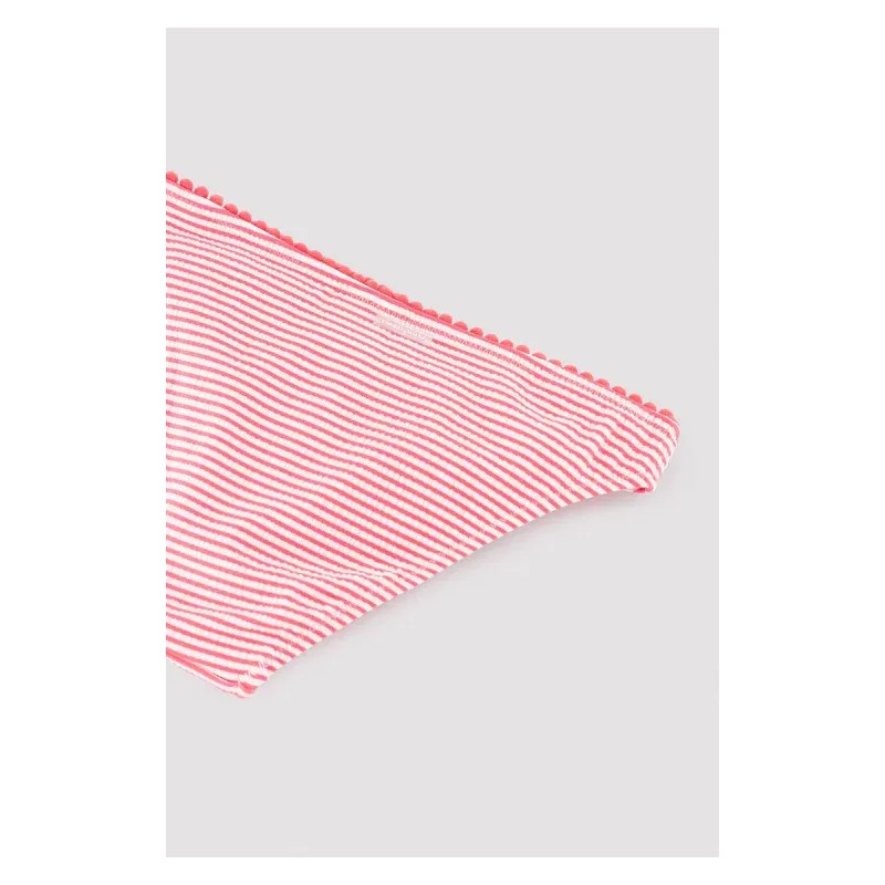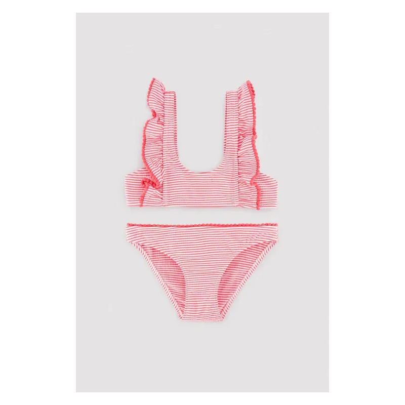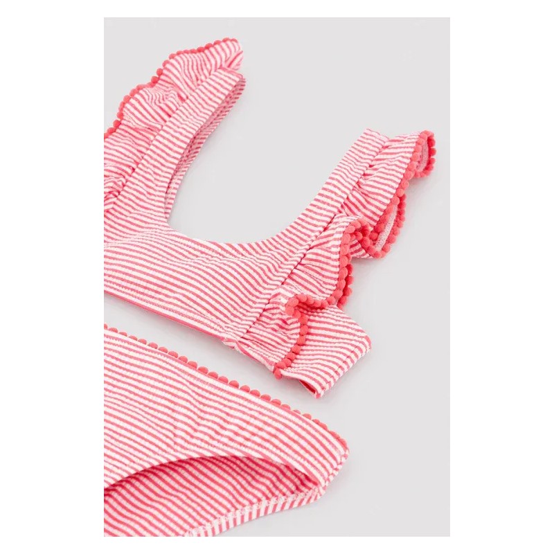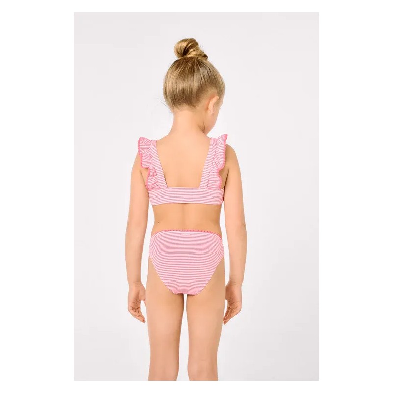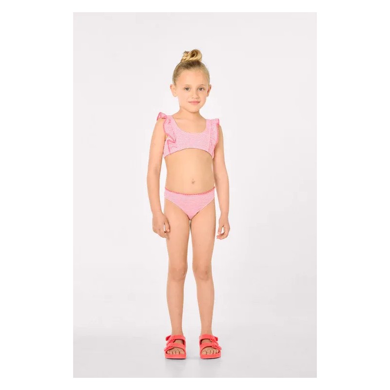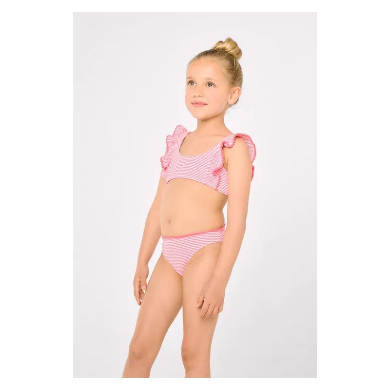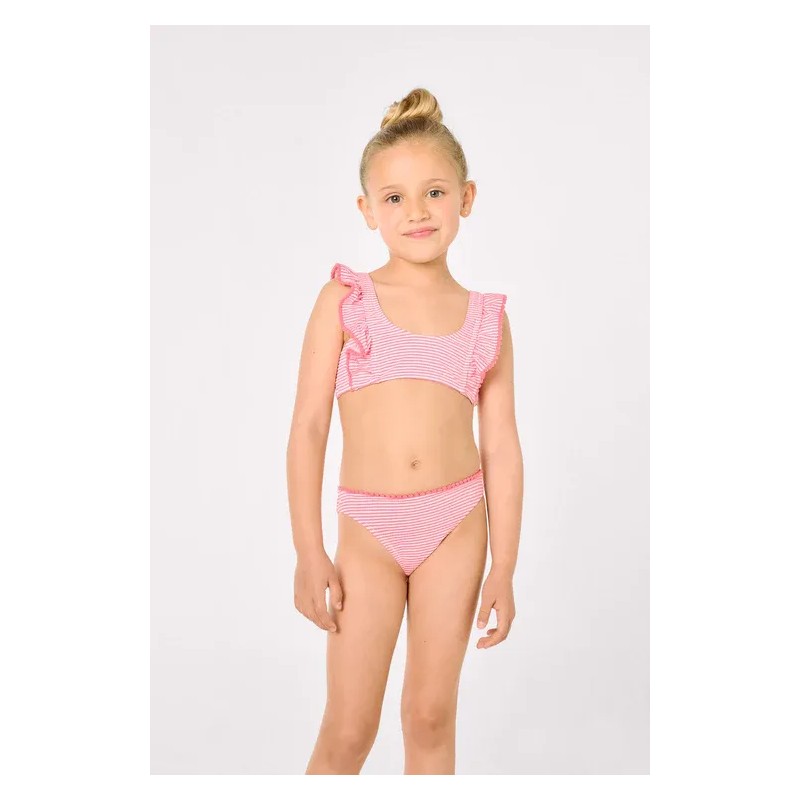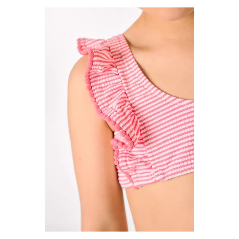 Bikini infantil con estampado de rayas de la colección Mini Me con tejido bambula y detalles de pompones en los bordes. El top presenta un diseño con volantes en los laterales.