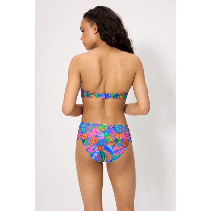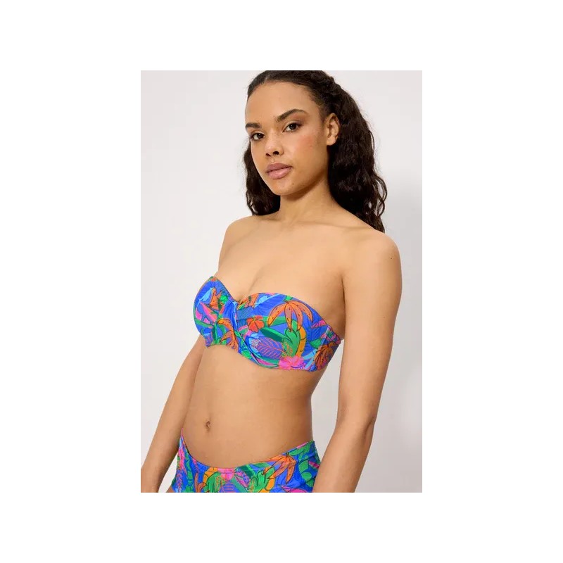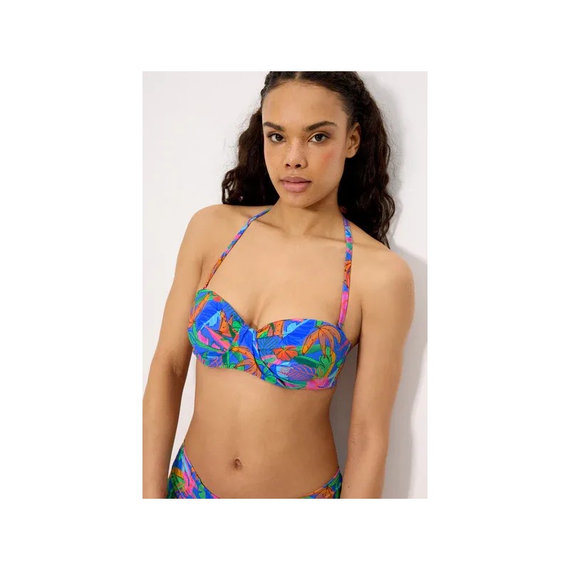 Top bikini bandeau con aro y con relleno. Tirantes desmontables anudados al cuello. Opción sin tirantes. Diseño estampado con detalle drapeado. Combínalo con una braga de bikini a conjunto para un look completo.
