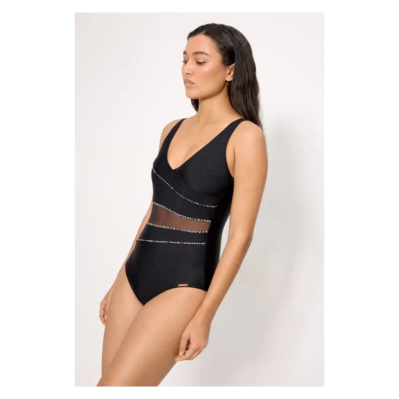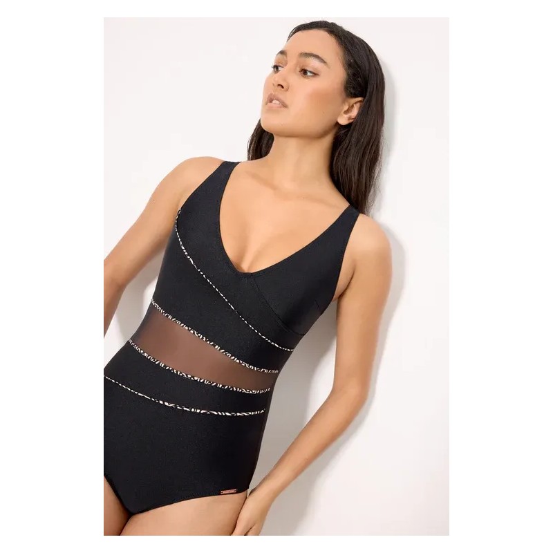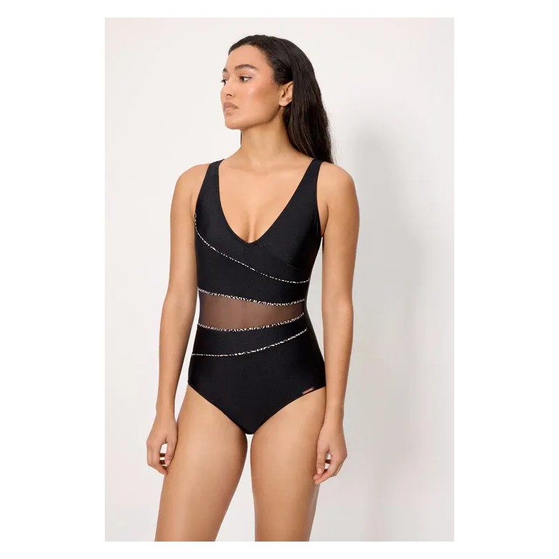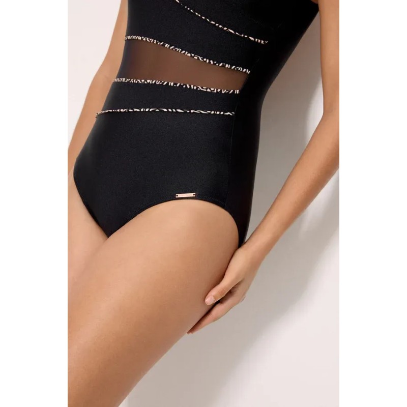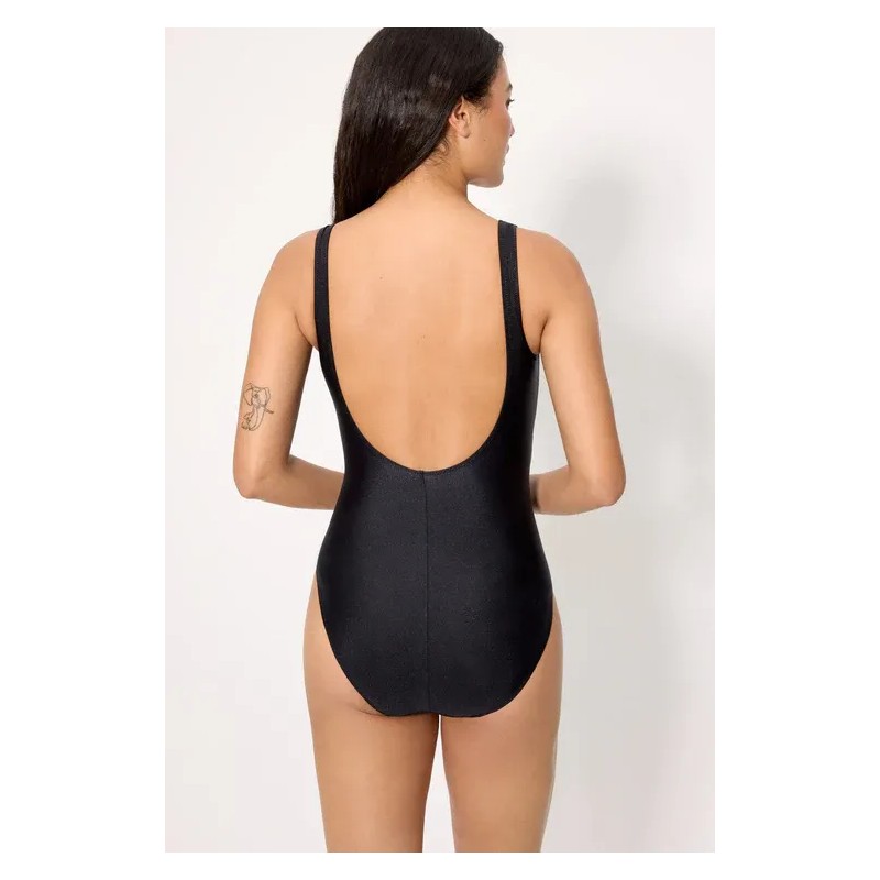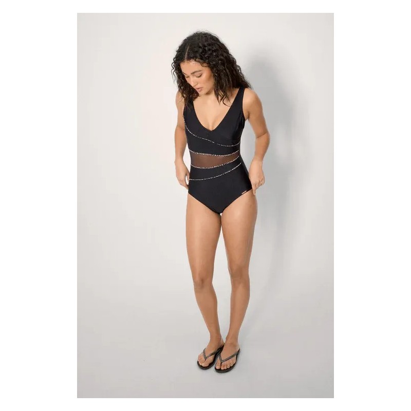 Bañador moldeador ligero con compresión en abdomen. Parte superior sin aro y con relleno. Tejido con acabado de brillo. Perfecto para un look veraniego y cómodo.