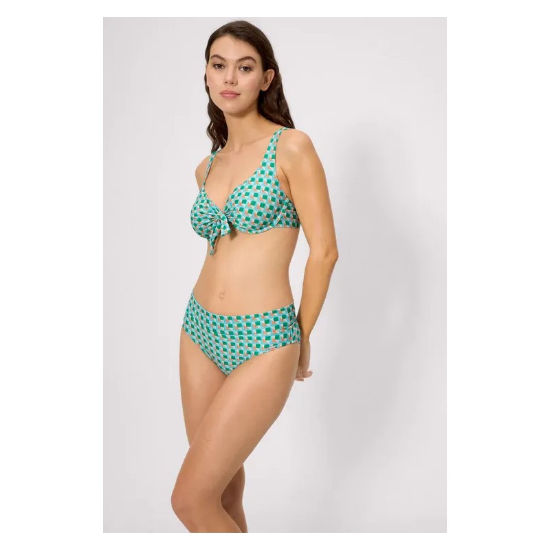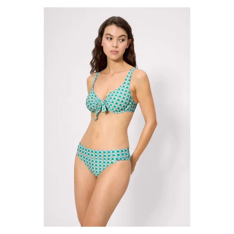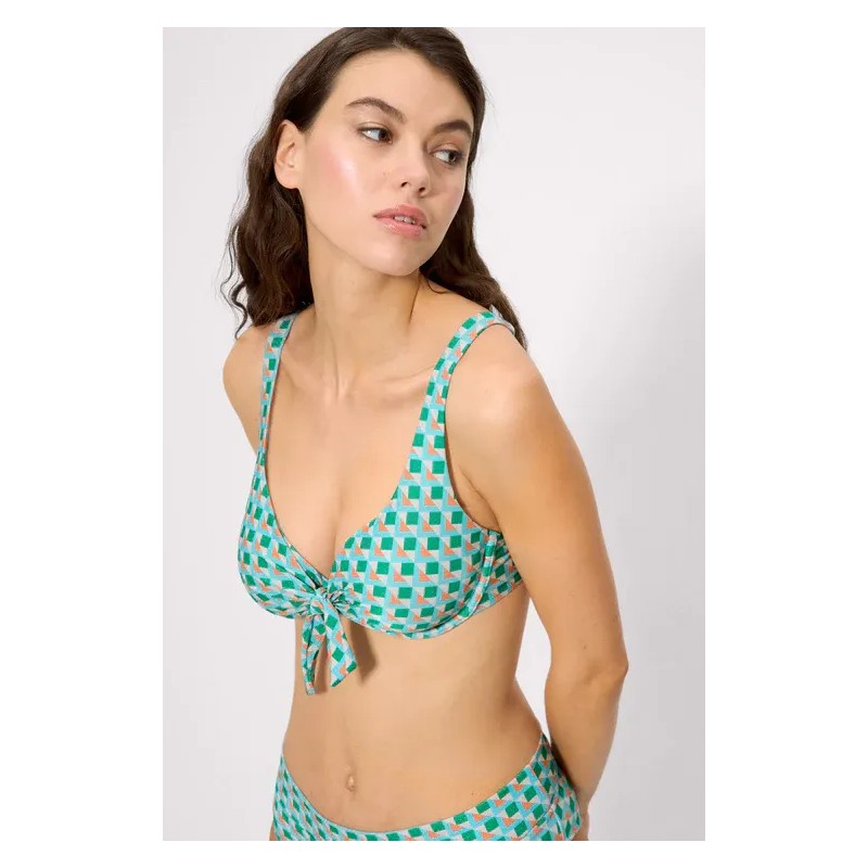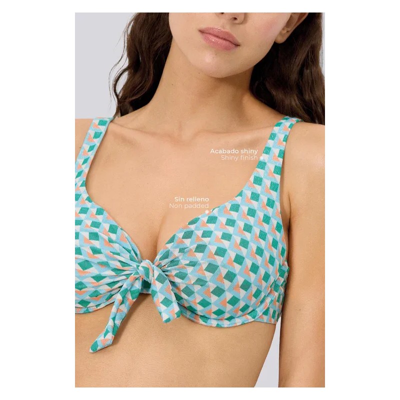 bikini con aro y sin rellenoTirantes anchos regulables. Detalle de lazo central. Cierre de broche trasero. Diseño estampado con acabado brillante. Textura lúrex. Combínalo con una braga de bikini a conjunto para un look completo.