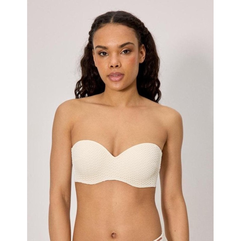 Top de bikini bandeau con aro y con relleno. Tirantes desmontables anudados al cuello. Tejido con textura calada.
