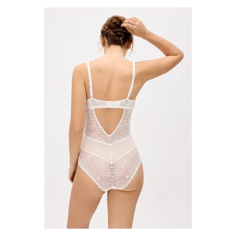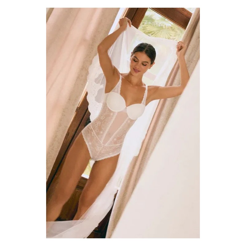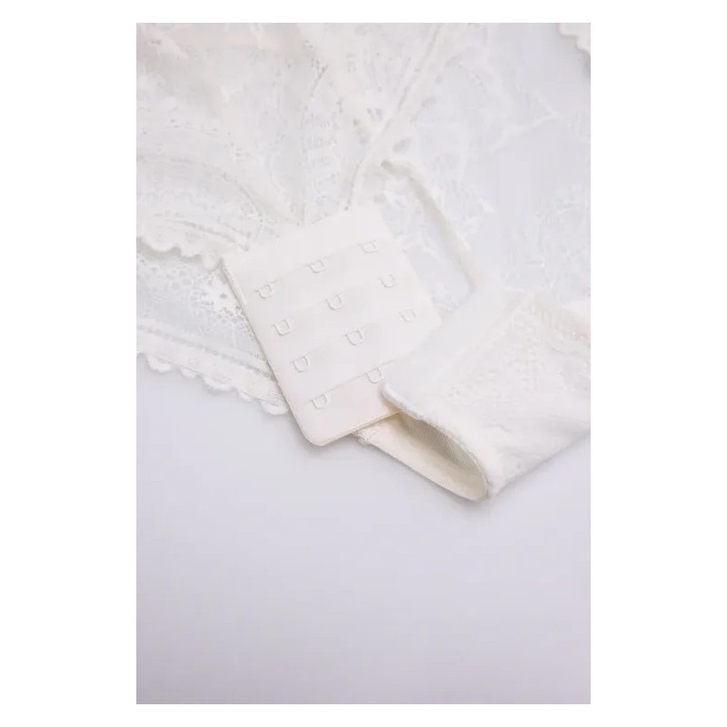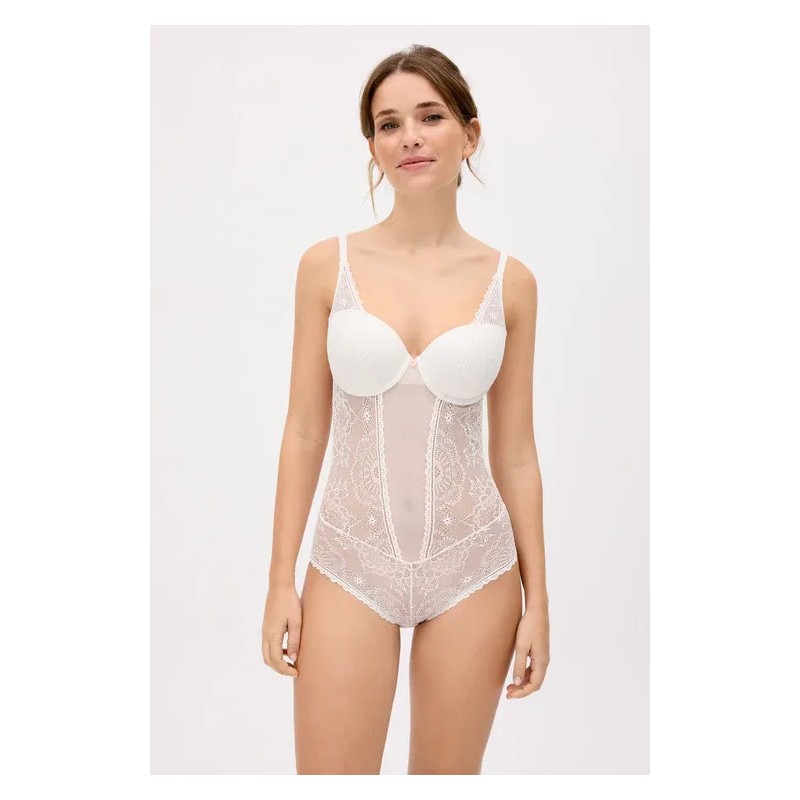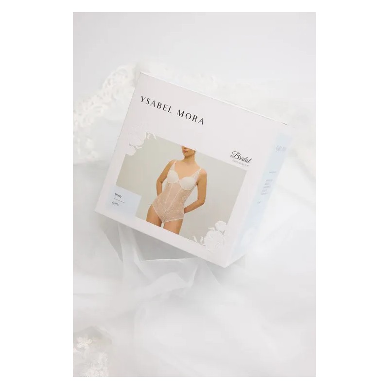 Body con aro y con relleno, ideal para novias. Destaca por sus laboriosos detalles de encaje y cierre inferior, ofreciendo una silueta impecable para el gran día.