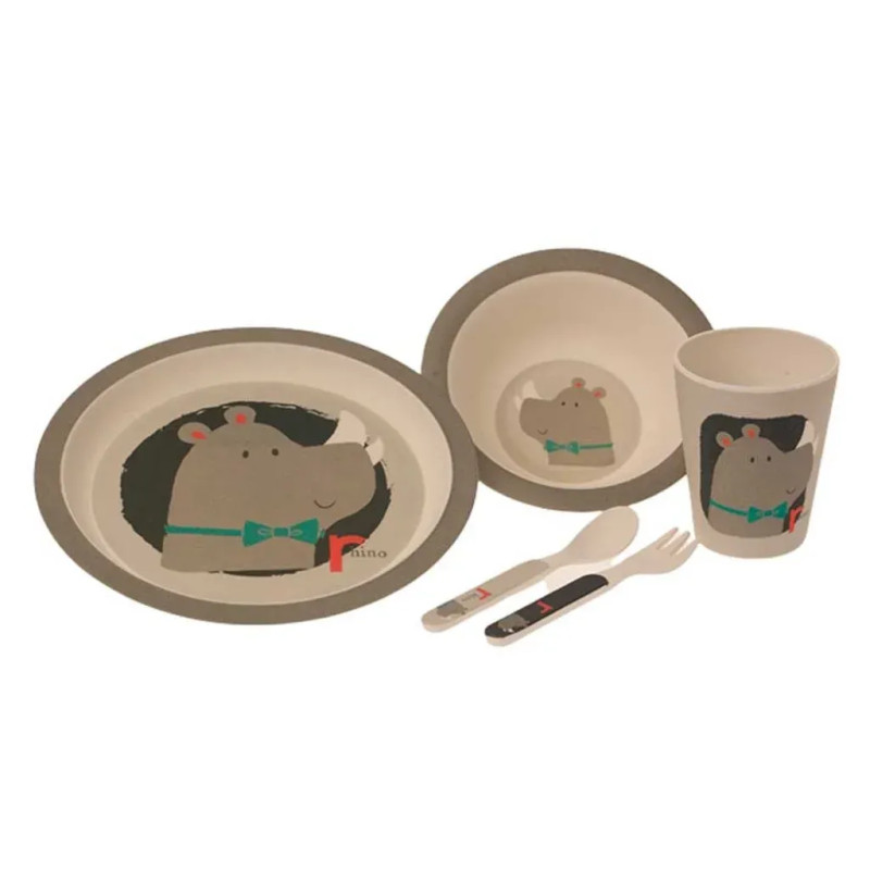 Juego vajilla infantil para bebé.  Dispone de diversos accesorios con dibujo de rinoceronte en sublimación