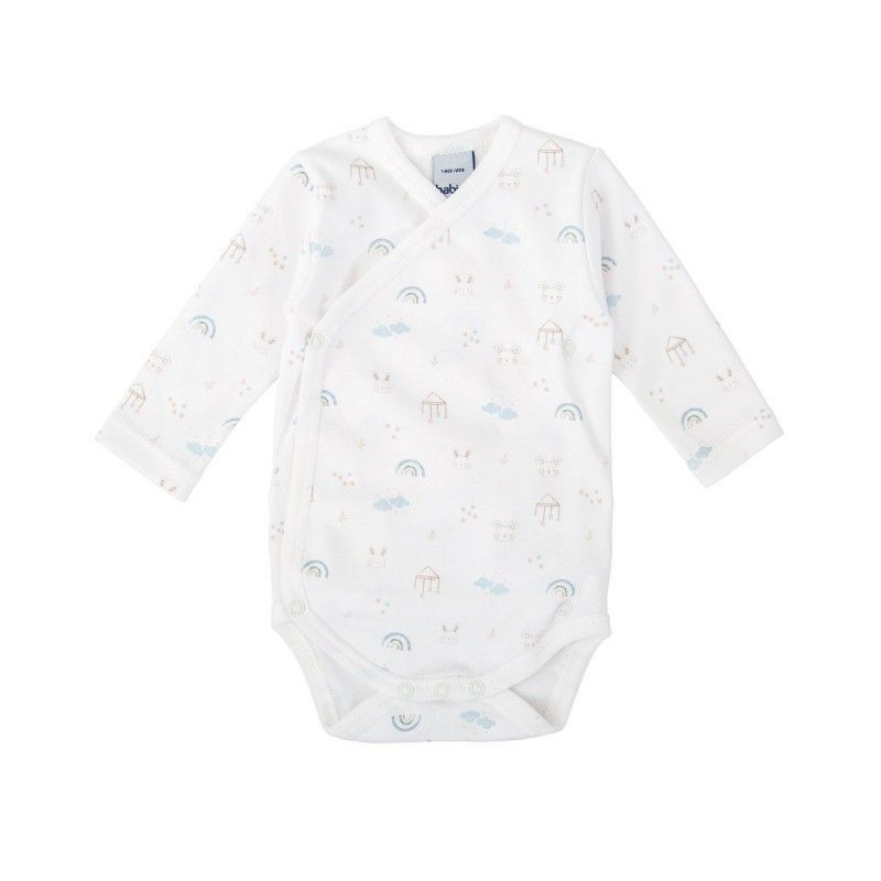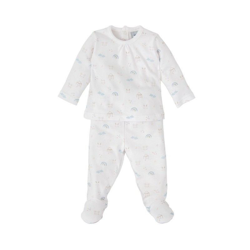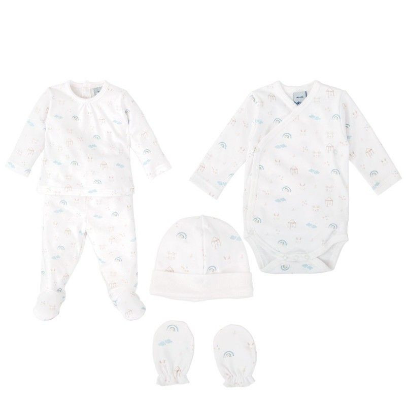 Este set de primera puesta es perfecto para dar la bienvenida al recién nacido con suavidad, comodidad y estilo. Confeccionado en algodón 100% de alta calidad, cada prenda presenta un dulce estampado en tonos pastel con arcoíris, nubes, ositos y casitas, aportando un aire tierno, neutro y armonioso.