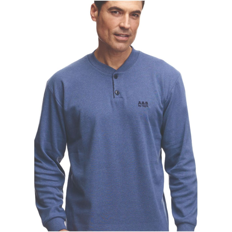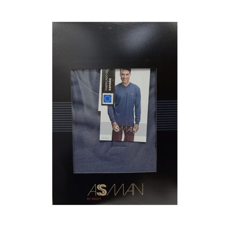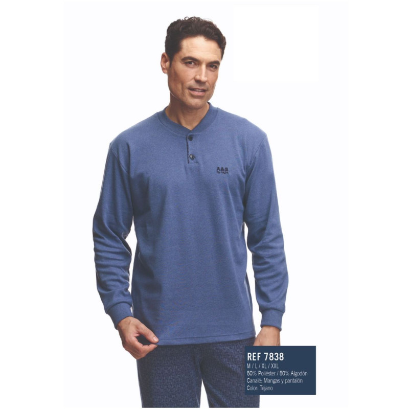 Pijama de punto invierno con interior perchado para hombre. Camiseta lisa color azul de manga larga con puños y cuello redondo con tapeta. Pantalón largo con puños y diseño geométrico con rectángulos marinos sobre fondo azul. Cintura de goma cubierta de gran confort. Composición: 50% algodón, 50% poliéster.