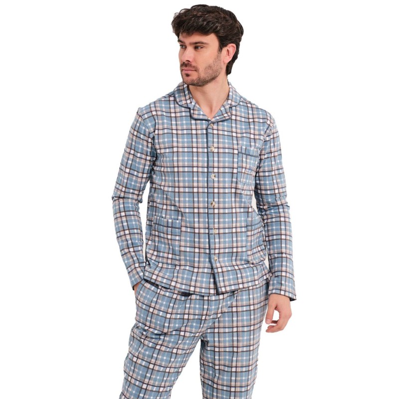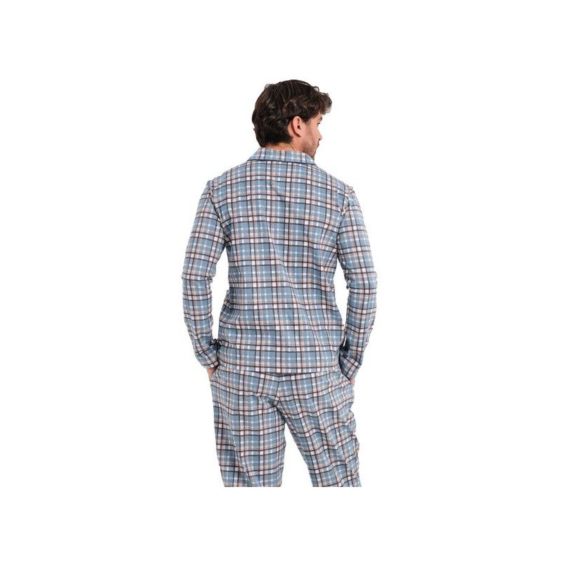 PIjama de caballero con la camiseta abierta con botones y cuello camisero a juego con el pantalón de cuadros en tonos muy otoñales con bolsillos y cordón en la cintura.
