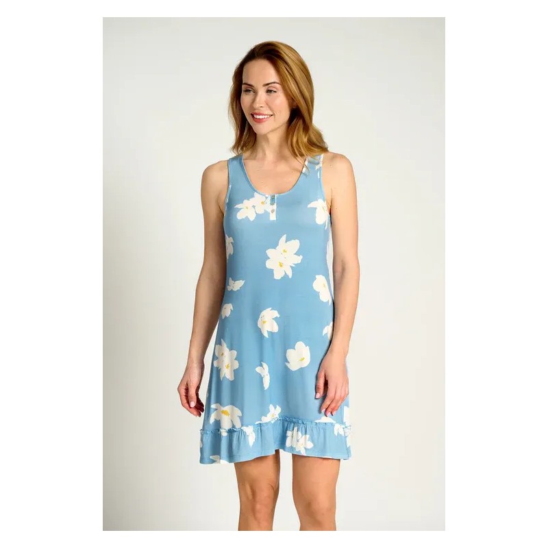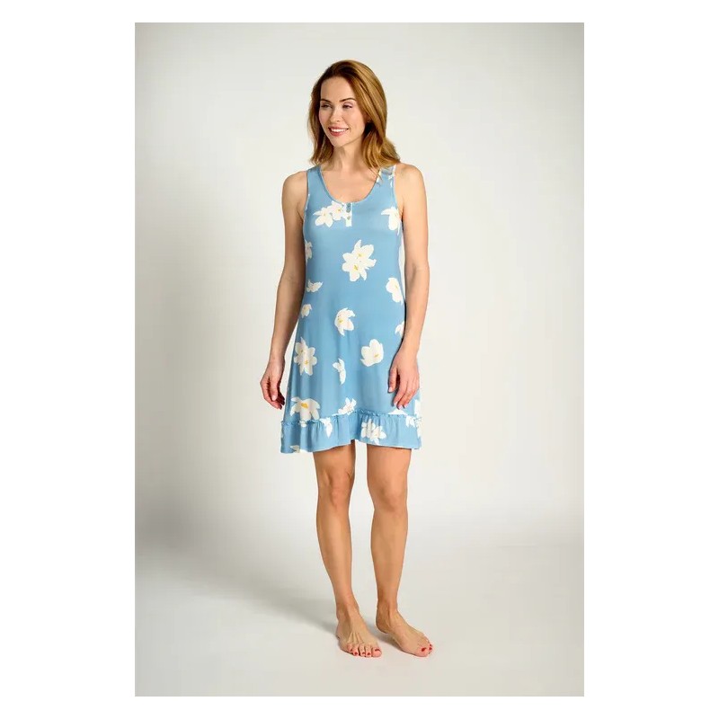 Camisón corto de tirantes con estampado floral sobre fondo azul. Confeccionado en tejido ligero, fresco y agradable al tacto, ideal para las noches de primavera y verano. Su diseño con volante en el bajo aporta un toque femenino y cómodo.