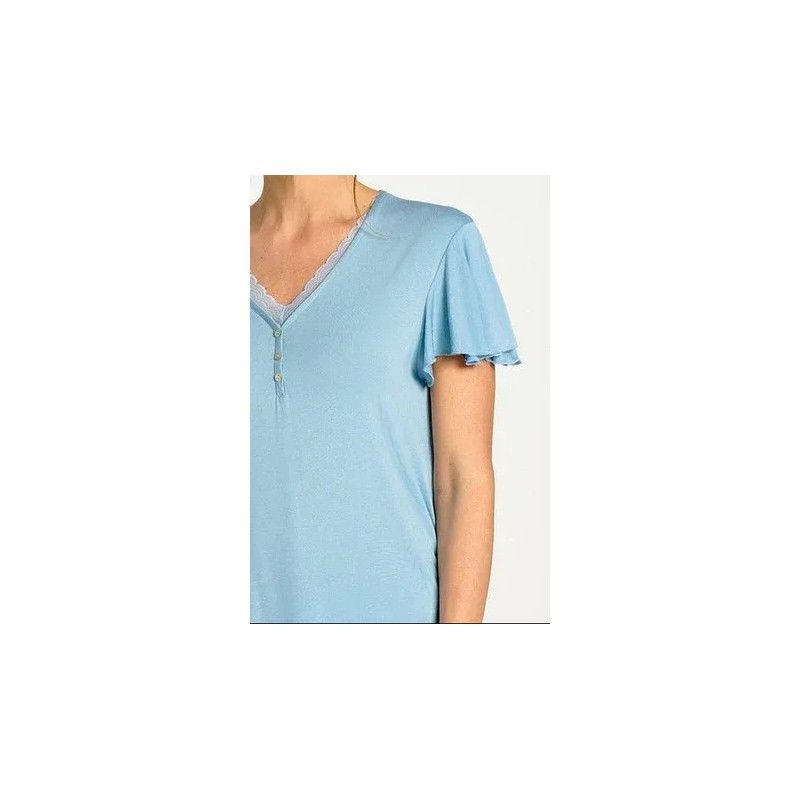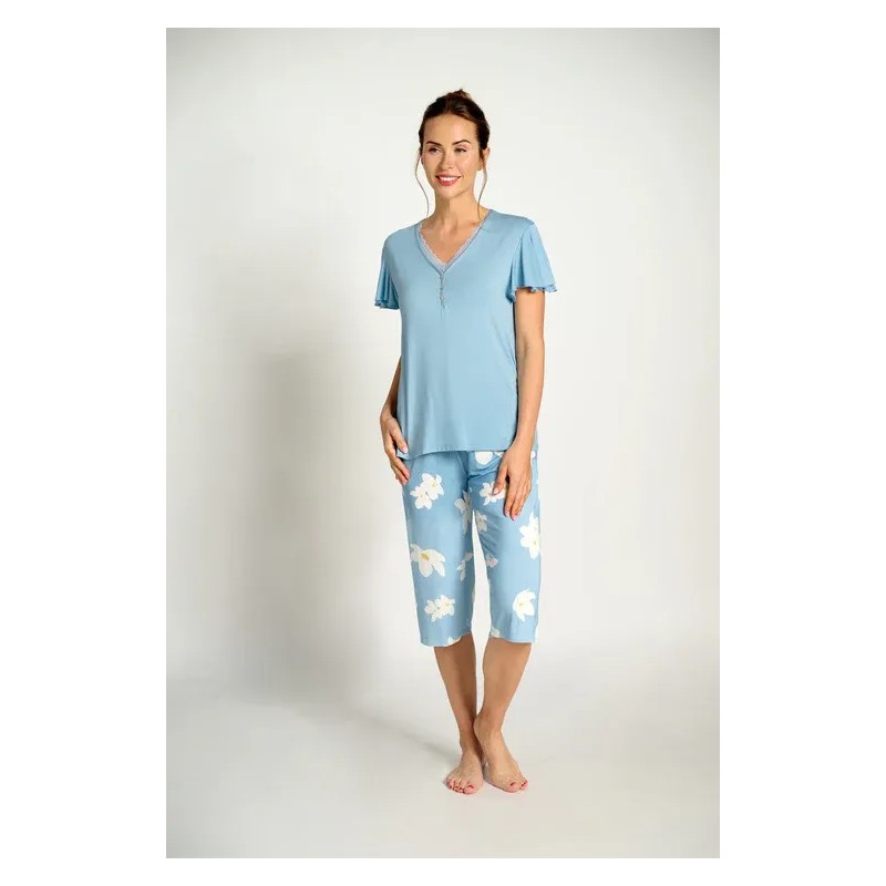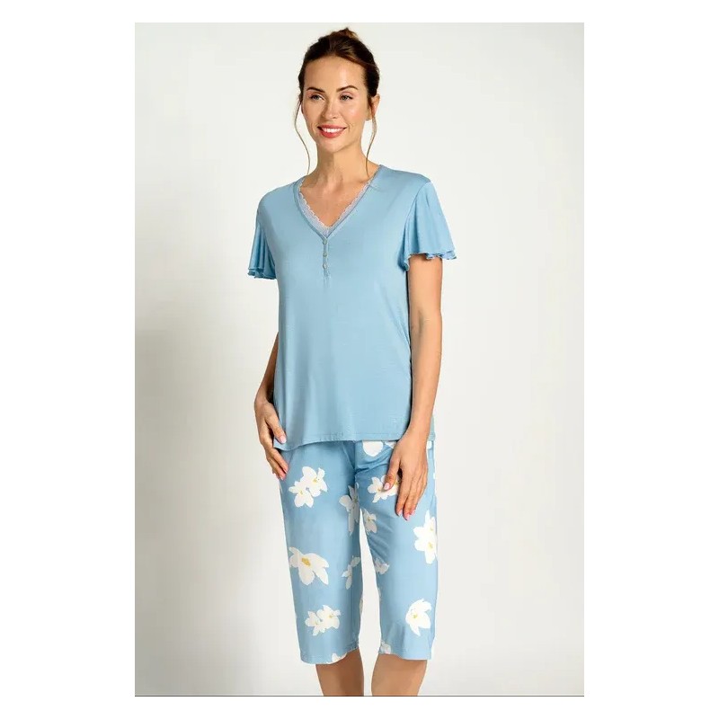 Renueva tus momentos de descanso con este pijama de mujer MUYDEMI compuesto por una camiseta de manga corta azul y un pantalón pirata y estampado floral, diseñado para ofrecerte comodidad y suavidad.