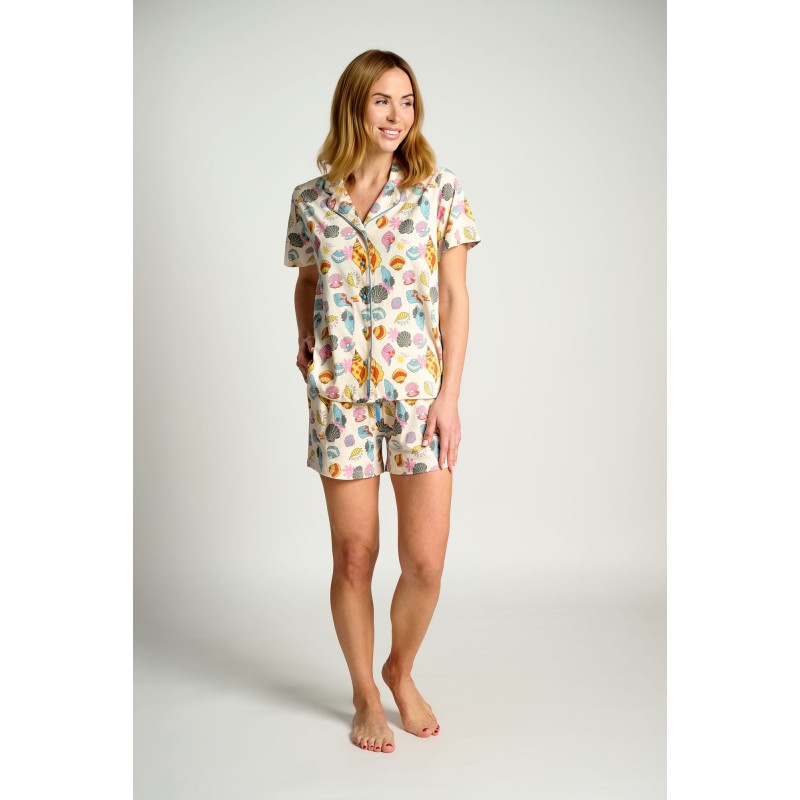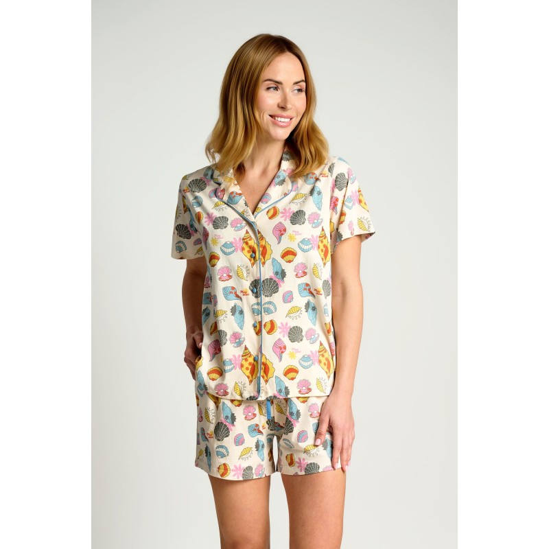 Pijama de señora 100% algodón con la camiseta abierta y solapa en el cuello y pantalón con bolsillos y cintura con lazo para un mejor ajuste.  Tiene un estampado muy divertido y veraniego, ideal para estar cómoda y fresquita en casa.