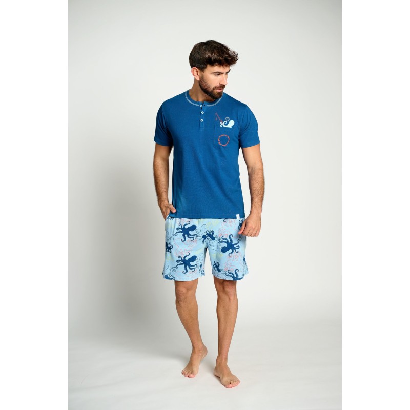 Pijama caballero con botonera y bolsillo , pantalón estampado de pulpos con bolsillos laterales.