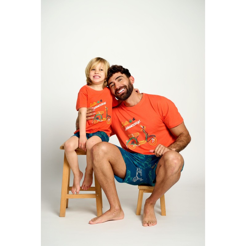 Pijama infantil 100% algodón, lo que lo hacen muy fresco y cómodo. Combina camiseta con una vespa de colorines y el pantalón a juego..