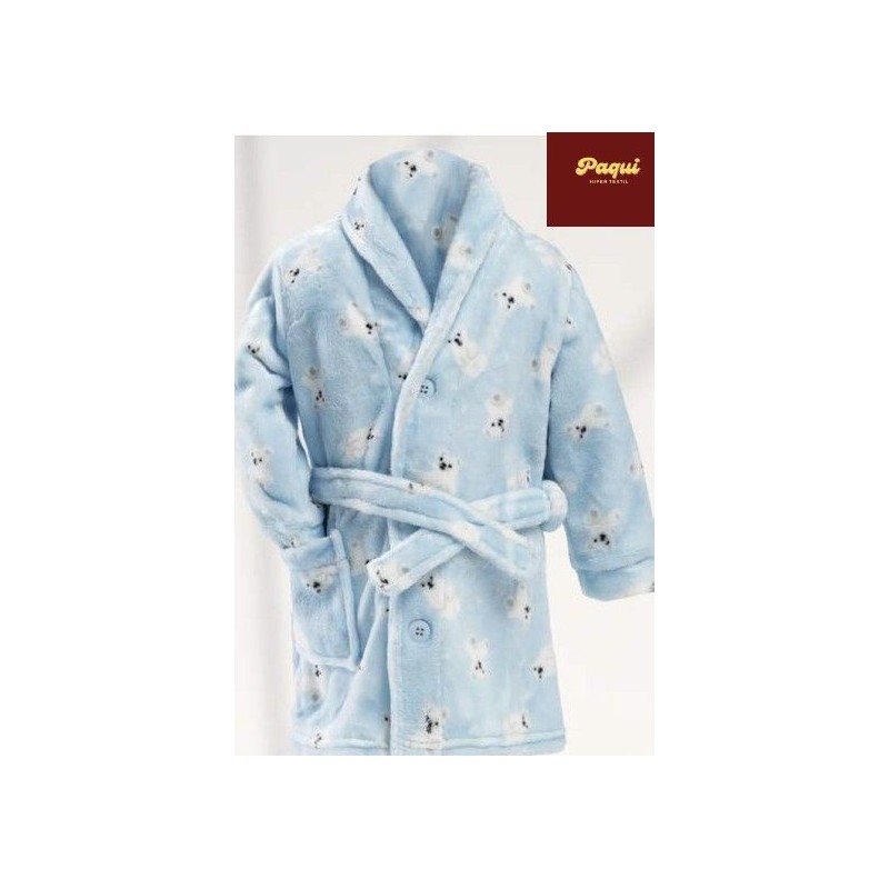 Bata de bebe de coralina abrochada con botones y cinturon con cuello de smoking.