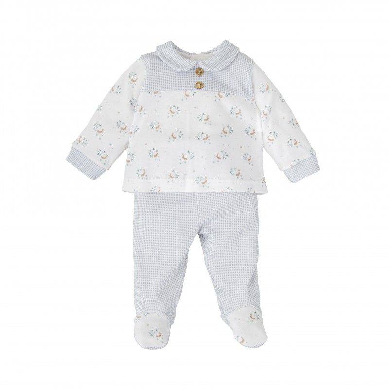 Conjunto de bebé con estampado floral y cuadros vichy celestes con botones decorativos