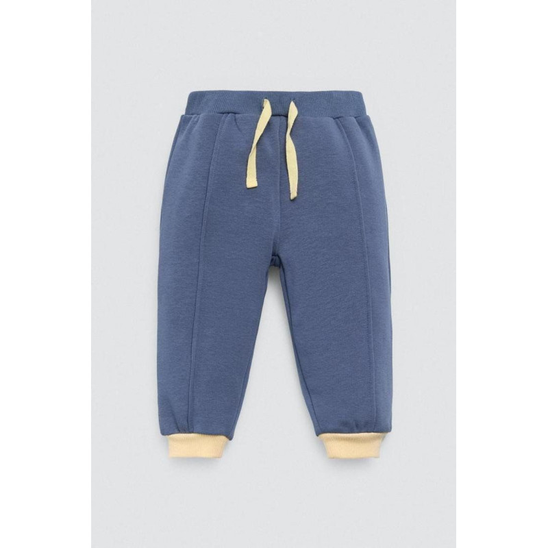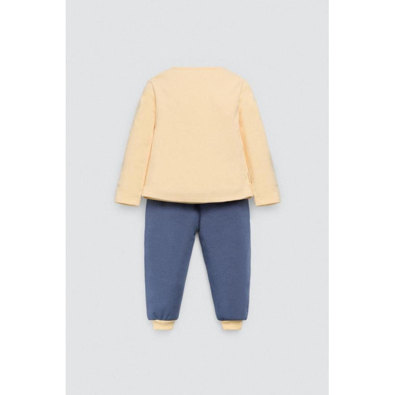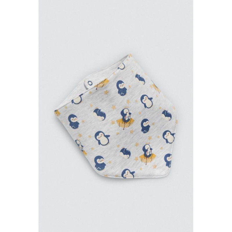 Conjunto de algodón natural para bebé formado por una camiseta,un pañuelo y unos pantalones que tienen cinturilla ajustable y rodilleras decorativas de pingüinos. Este modelo se caracteriza por tener un interior afelpado.