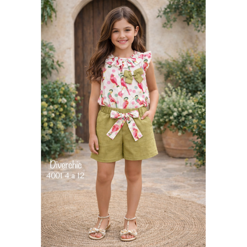 Conjunto infantil Diverchic compuesto por blusa estampada y short de lino, ideal para la campaña de primavera-verano