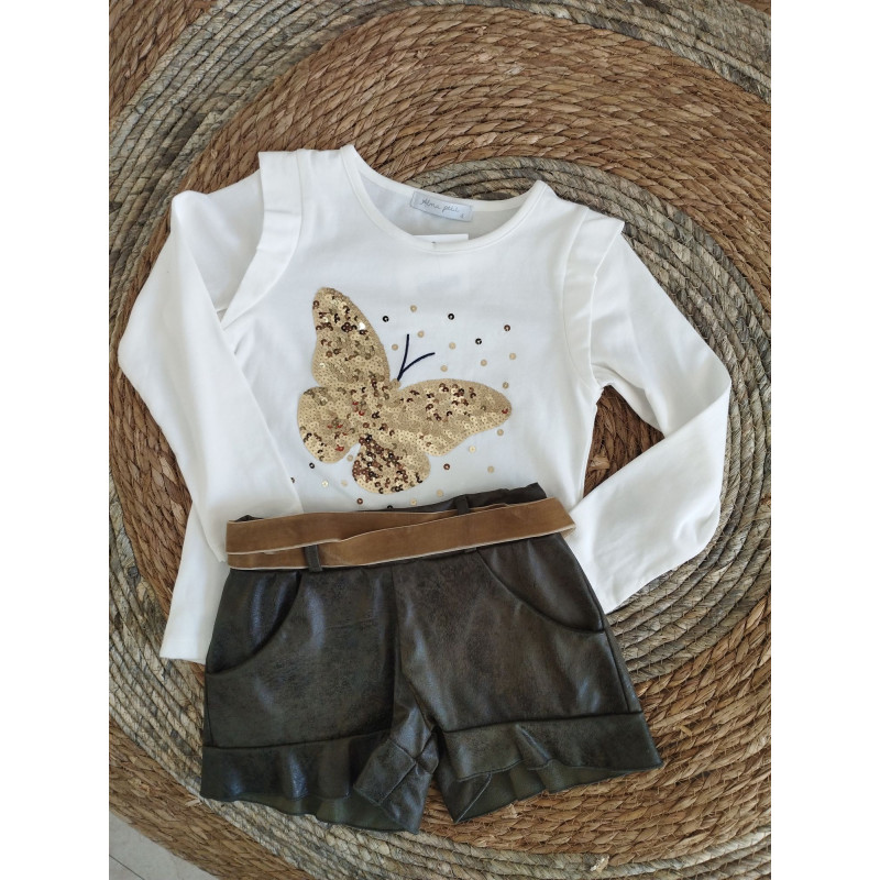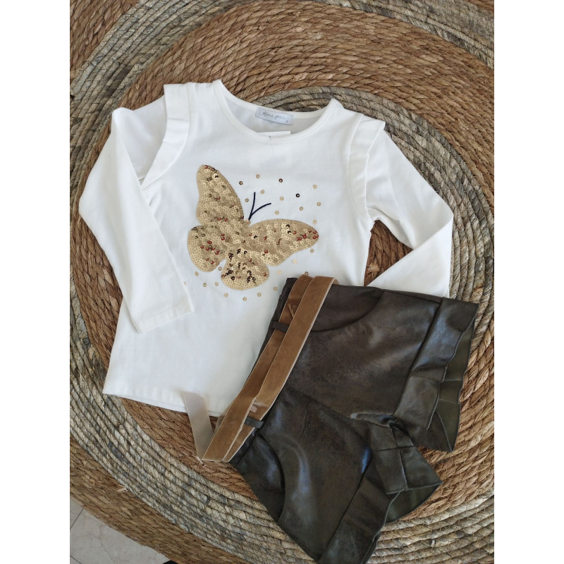 Conjunto de niña compuesto por pantalón en un material muy cómodo simulando a polipiel y camiseta con mariposa de brilli brilli.