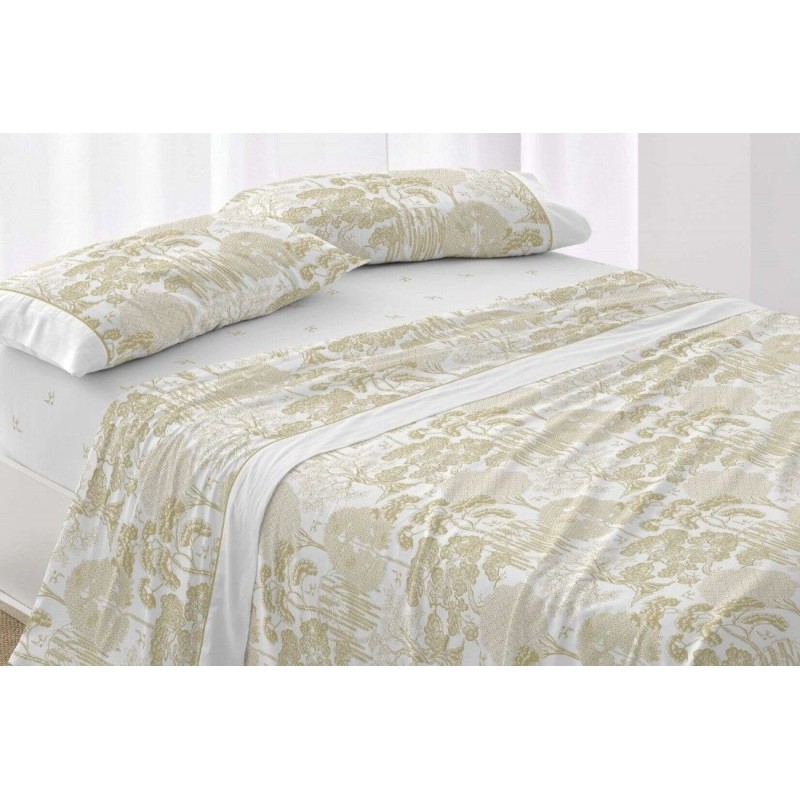 Composición: 50% algodón - 50% poliéster. Esta mezcla está orientada a ofrecer un tacto agradable y una buena durabilidad, con la ventaja de un mantenimiento sencillo y un planchado más rápido que en tejidos 100% algodón. El estampado está trabajado para conservar el contraste entre el fondo blanco y los motivos azul grisáceo, manteniendo la lectura del dibujo incluso en dormitorios muy luminosos.