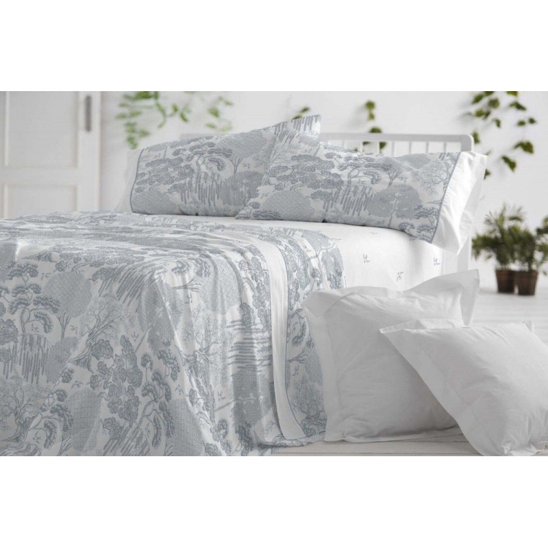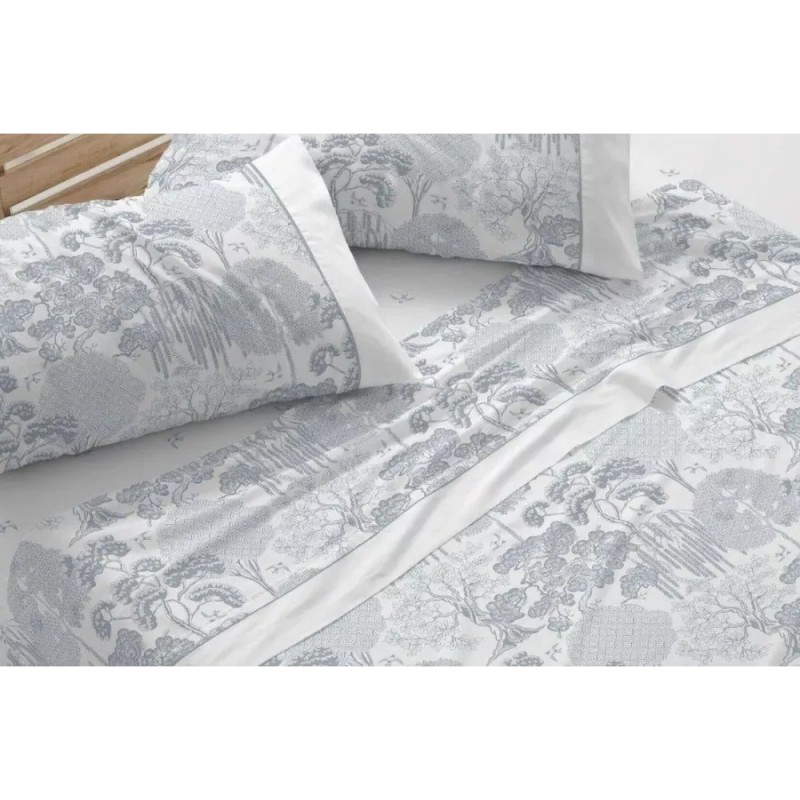 Juego de sábanas con un estampado botánico de inspiración japonesa en tono azul grisáceo sobre fondo blanco, evocando la delicadeza monocromática del Toile de Jouy y la calma del wabi-sabi en clave Japandi. La encimera y la funda de almohada repiten el paisaje de árboles, rematado con aplicación blanca y ribete en azul grisáceo; la bajera incorpora un sutil motivo de pajaritos a juego.